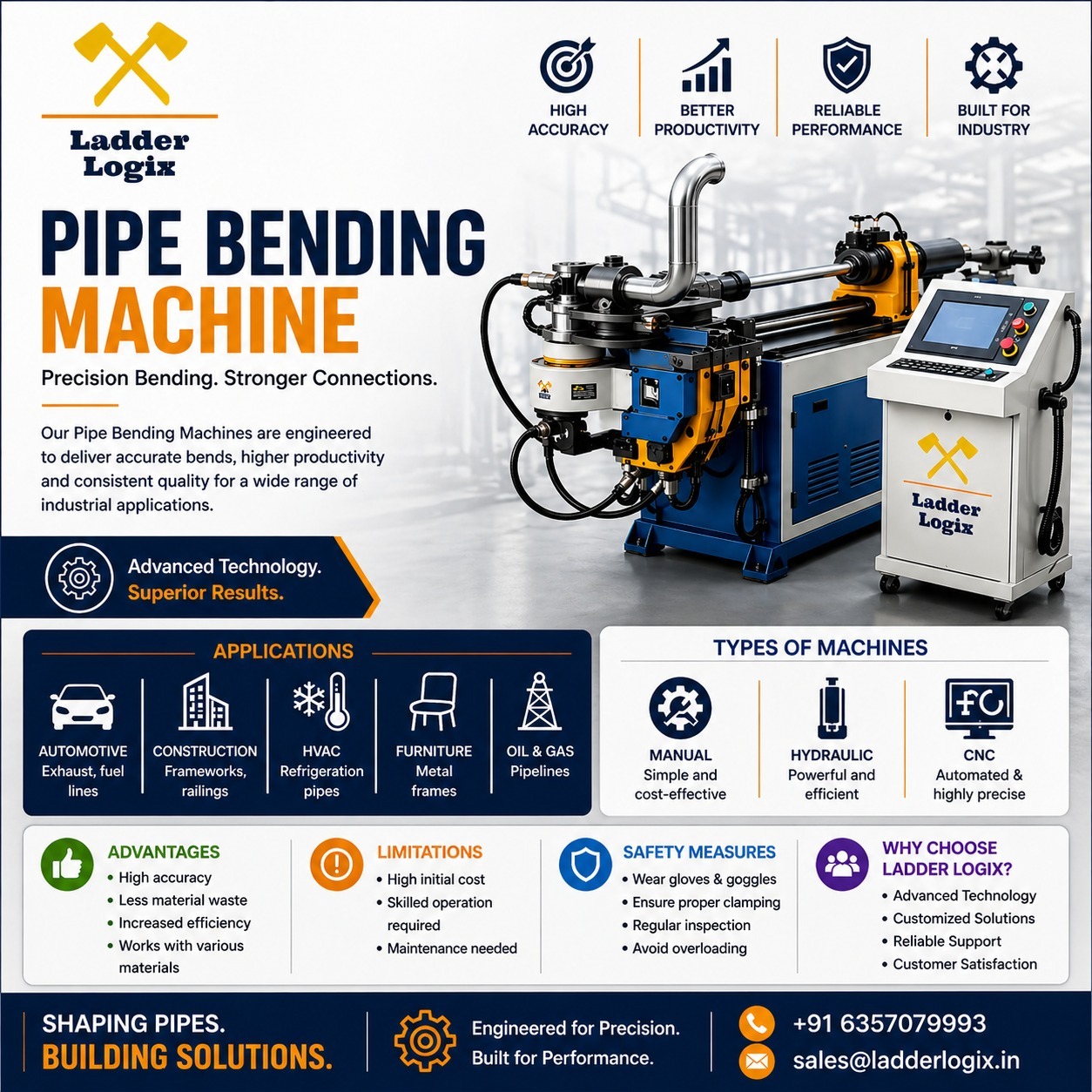 Enhance your manufacturing efficiency with advanced Pipe Bending Machines from Ladder Logix. Designed for high accuracy, better productivity, and reliable performance, our machines deliver consistent results across applications like automotive, construction, HVAC, furniture, and oil & gas industries. Built with cutting-edge technology and engineered for precision, we help you reduce material waste while maximizing output. Choose smarter automation solutions that strengthen your production capabilities and drive long-term success. #PipeBendingMachine #IndustrialAutomation #Manufacturing #EngineeringSolutions #Productivity #AutomationIndustry #MakeInIndia #LadderLogix #IndustrialMachines #SmartManufacturing #HVAC #OilAndGas #Construction #AutomotiveIndustry