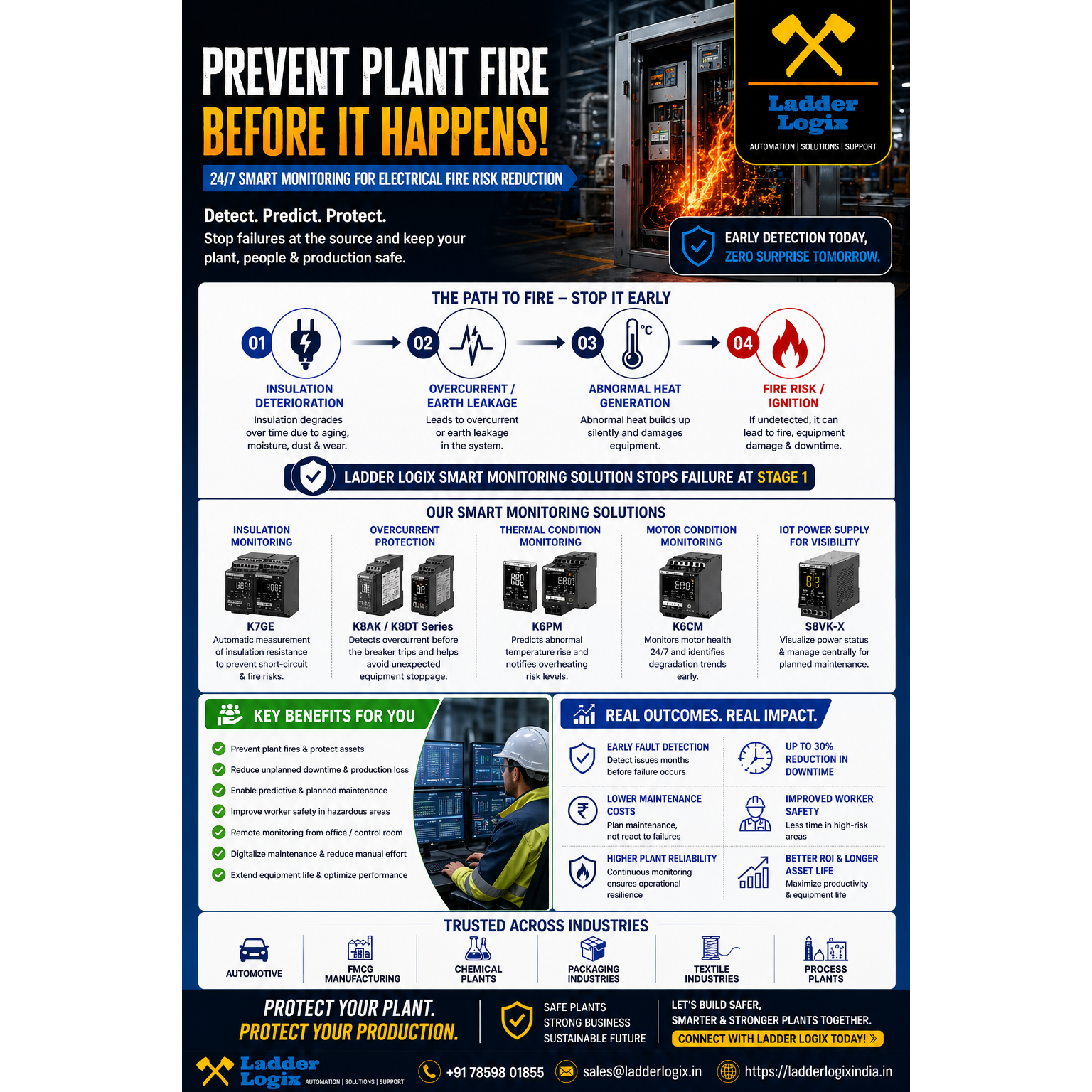 Factory fires don’t happen instantly—they give warning signs. From insulation degradation to abnormal heat generation, early monitoring can prevent major losses. Ladder Logix helps industries move from reactive maintenance to predictive protection using smart monitoring solutions. ✅ Reduce downtime ✅ Prevent fire hazards ✅ Improve operational safety Let’s build safer factories together. #LadderLogix #IndustrialAutomation #PredictiveMaintenance #FactorySafety #ElectricalSafety #Industry40 #PlantMaintenance #Omron #SmartFactory